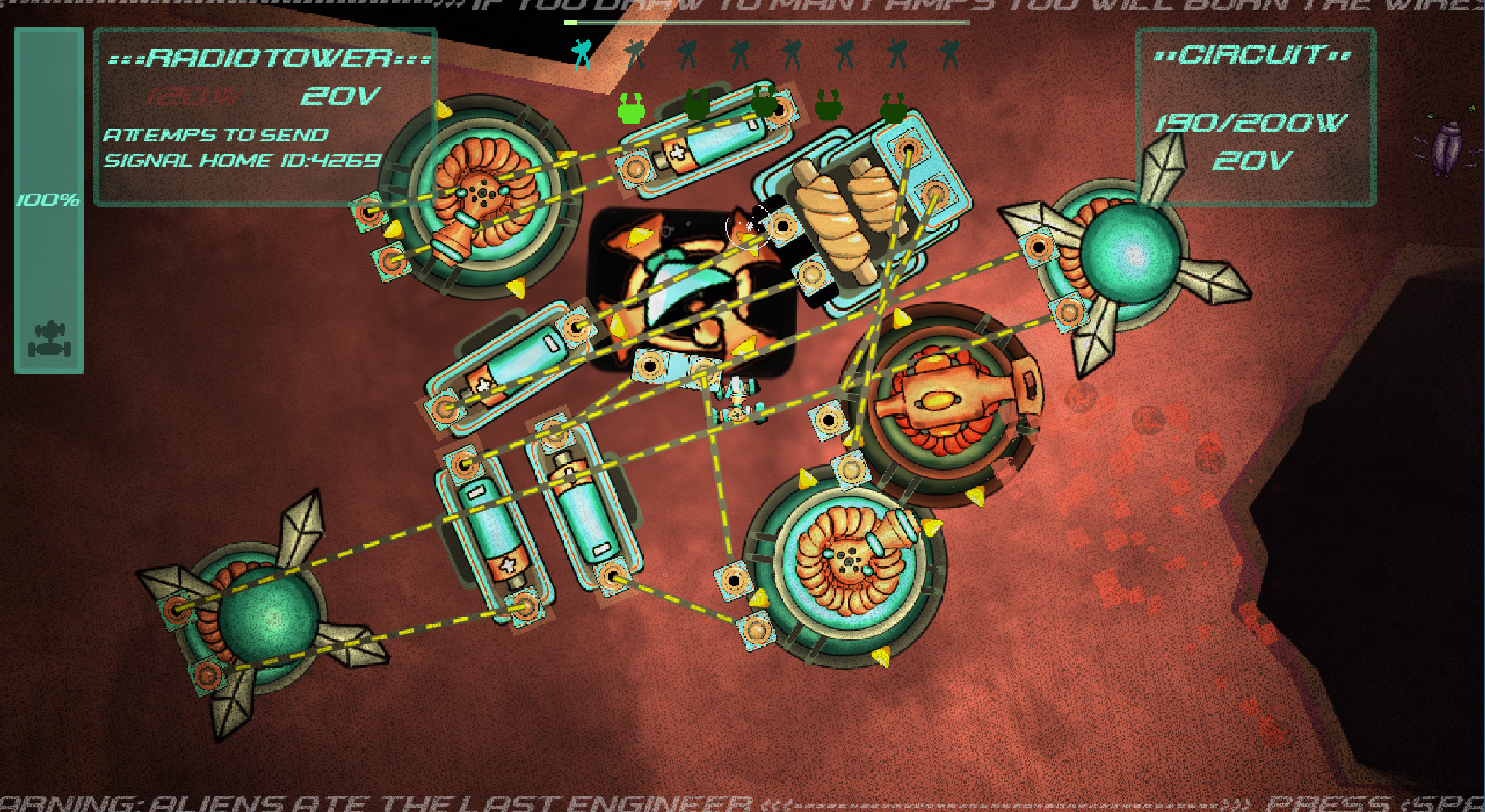 Design efficient electrical loops, avoid overloads, and unlock new tech as your circuit grows, All while defending against relentless waves of aliens and trying to communicated back home.